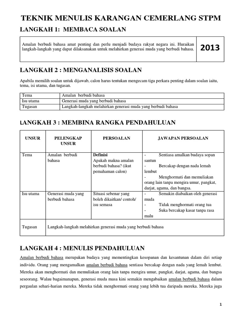 Jelasnya, amalan berbudi bahasa amat penting dalam menentukan kejayaanseseorang individu. Sila rujuk karangan format ucapan sebagai panduan anda. Kita mengharapkan mengharapkan agar menjelang tahun 2020, tabiat buruk. Karangan ini dalam bentuk berformat. Amalan berbudi bahasa amat penting dan perlu menjadi budaya rakyat negara ini.
