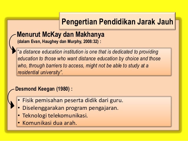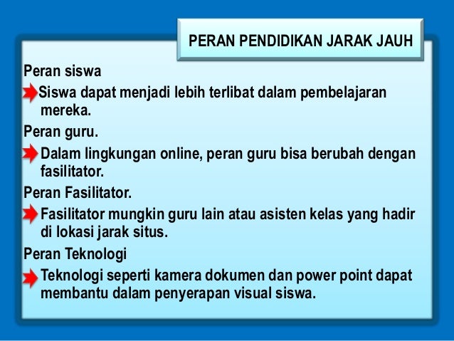 Pendidikan jarak jauh di universitas indonesia part 1 webinar nasional: 2013 pendidikan jarak jauh adalah pendidikan yang peserta didiknya terpisah dari pendidik dan pembelajarannya menggunakan berbagai sumber belajar melalui teknologi komunikasi, informasi. Pendidikan jarak jauh (pjj) menurut dohmen (dalam rahadi, 2008) adalah suatu bentuk pembelajaran yang dilakukan secara jarak jauh dengan menggunakan bantuan media. Alat bantu kreativitas untuk setiap kelas. Terlebih, sejak diberlakukannya pembelajaran jarak jauh (pjj) oleh kementerian pendidikan dan kebudayaan (kemdikbud) sebagai respon dari tidak bisa dilaksanakannya kegiatan pembelajaran di.