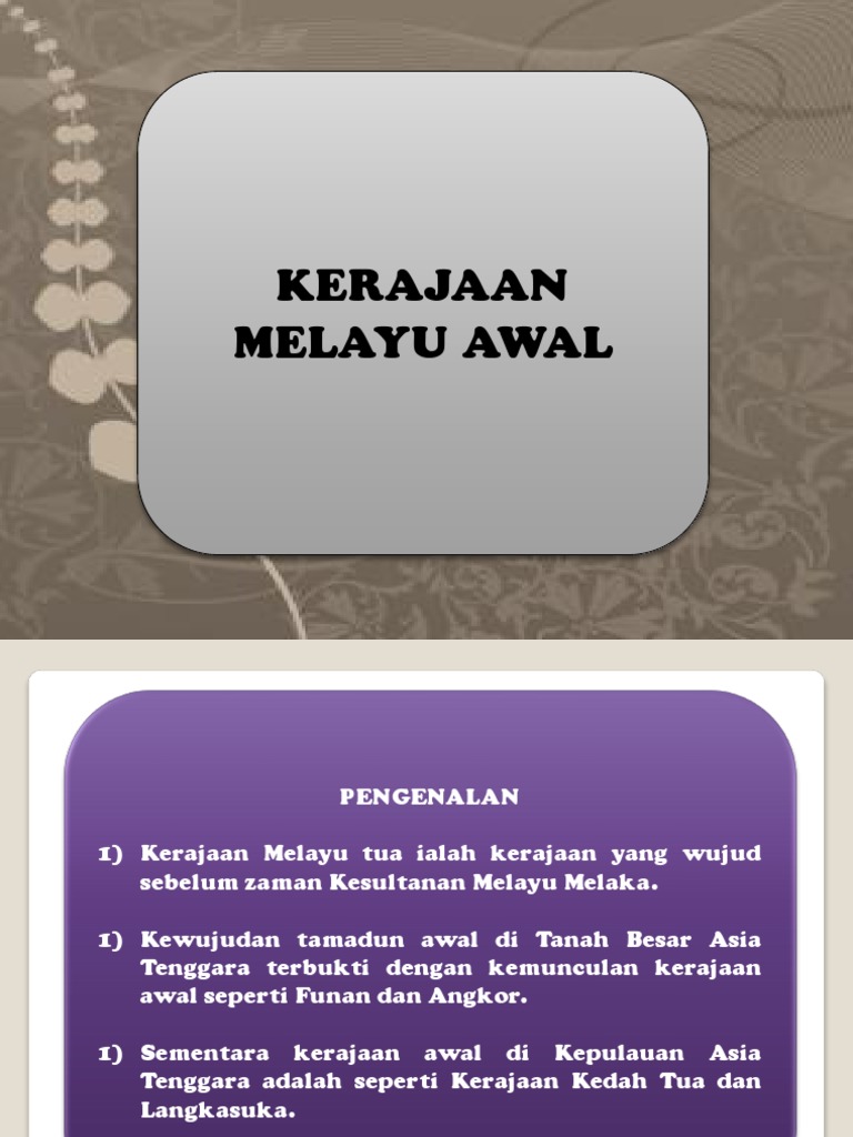 Kerajaan Kerajaan Awal Di Tanah Melayu from image.slidesharecdn.com Menye!ut kei$timewaan kerajaankerajaan melayu awal. Penjajahan portugis di tanah melayu kejatuhan melaka ke tangan orang portugis berlaku pada 1511. Walaupun ketiganya mempunyai kemiripan budaya dalam rumpun melayu, persaingan dan kompetisi terjadi. Perundangan kedatangan agama islam telah mempengaruhi sistem perundangan di tanah melayu. Menamakan laut, selat, teluk dan pulau pada peta di sekitarkerajaan melayu awal. Ini kerana lembah sungai ialah suatu kawasan yang mempunyai tanah yang lembap dan juga memudahkan kerajaan alam melayu untuk bercucuk tanam. Pada ketika itu sudah berlaku perkahwinan antara pedagang muslim dari tanah arab dengan wanita melayu. Dan per!in+angan tentang l%ka$i ).