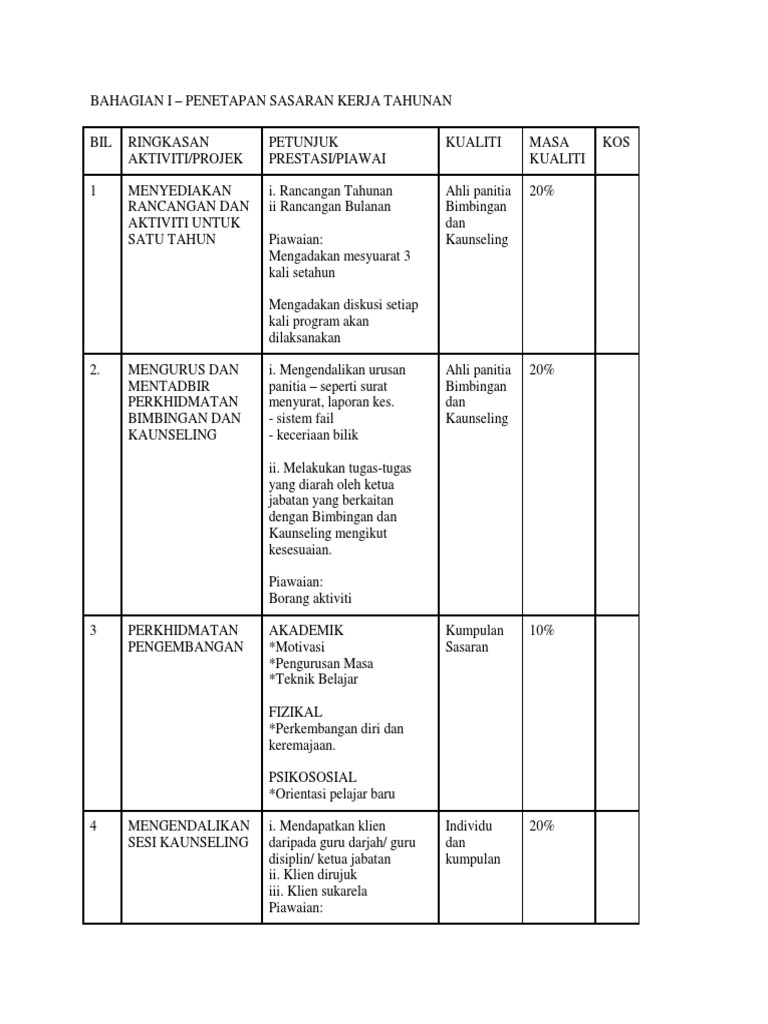 Skt ini lebih kepada para guru yang perlukan rujukan. Sasaran kerja tahunan 2011pegawai perkhidmatan pendidikan kementerian pelajaran malaysia nama guru : Aktiviti penting proses penyediaan sasaran kerja tahunan iaitu perancangan tahunan jabatan, penetapan rancangan kerja bahagian/cawangan/unit, penetapan sasaran. (diisi pada awal tahun)kajian pertengahan tahunpencapaian akhir tahun. Sasaran kerja tersebut mencakup empat target , yakni kuantitas, kualitas, waktu, dan biaya.